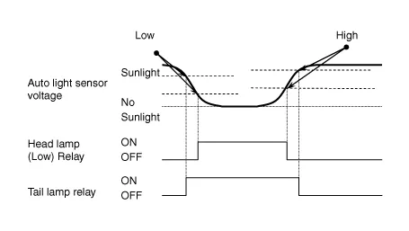 • Failure Occurrence : If auto light failure occurs, the head lamp must be turned ON regardless of sun light level. This is to prevent the head lamp from being turned OFF in case of auto light failure during night time.