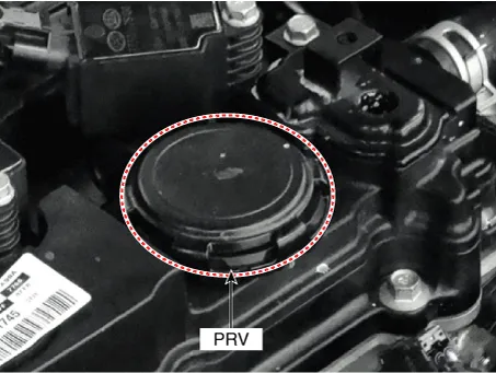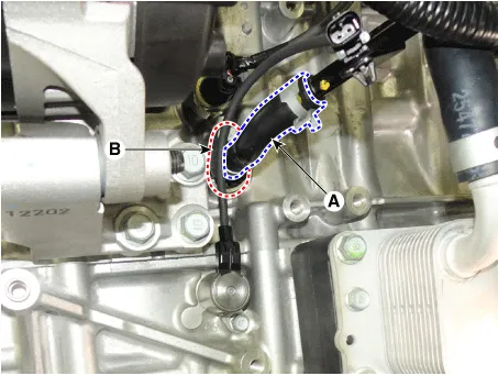 5.Disconnect the crankcase check valve hose (A) and then remove the crankcase check valve (B).