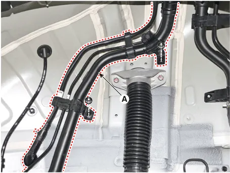 5.Loosen the mounting nuts, separate the filler neck assembly (A).