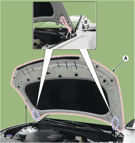 1.After loosening the hood hinge (B) mounting bolts, remove the hood assembly (A).