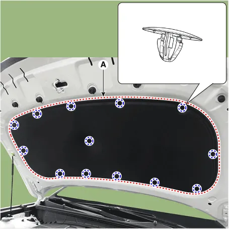 1.Using a clip remover, remove the clips and then the hood insulator pad (A).