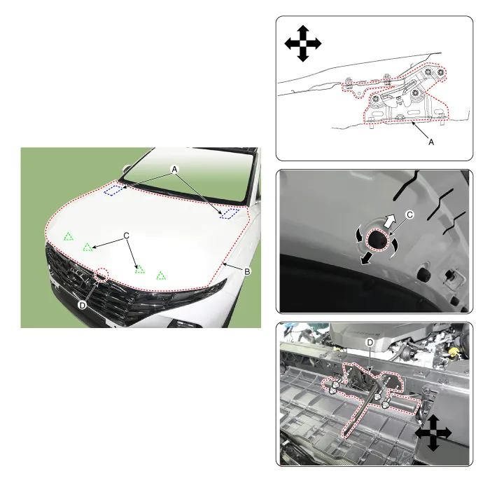 3.After loosening the hood latch (D) mounting bolts, adjust the latch by moving it up and down or from side to side.