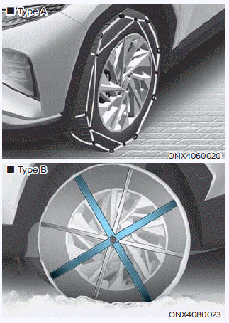 Since the sidewalls of radial tires are thinner than other types of tires, they may be damaged by mounting some types of tire chains on them. Therefore, the use of snow tires is recommended instead of tire chains. If tire chains must be used, use genuine HYUNDAI Parts and install the tire chains after reviewing the instructions provided with the tire chains. Damage to your vehicle caused by improper tire chain use is not covered by your vehicle manufacturer’s warranty.