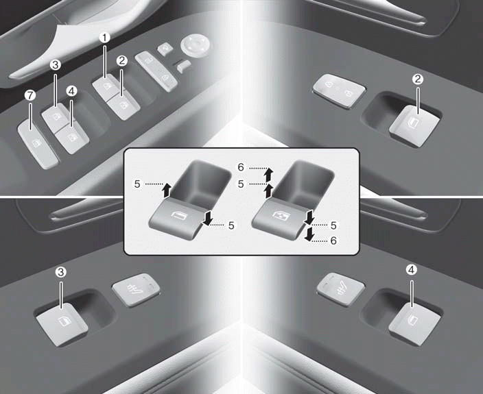 The ignition switch must be in the ON position to be able to raise or lower the windows. Each door has a Power Window switch to control the door’s window. The driver has a Power Window Lock button that can block the operation of rear passenger windows. The power windows will operate for about 3 minutes after the ignition is turned OFF or if the ignition is placed in the ACC position, as long as the front doors remain closed.
